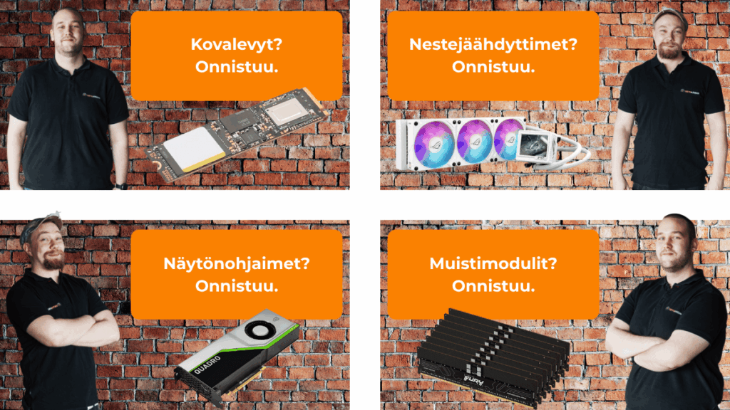 Meiltä saat käytännössä minkä tahansa tietokoneen komponentit yhdestä paikasta. Kauttamme saat muistit, jäähdyttimet, näytönohjaimet, kovalevyt ja monet muut komponentit. Kerro, mihin konetta käytät, me mitoitamme osat oikein, varmistamme yhteensopivuuden ja asennamme ne valmiiksi. Tarvittaessa siirrämme datan vanhalta levyltä, testaamme että kone käynnistyy nopeasti, lämpötilat pysyvät kurissa ja äänitaso on miellyttävä. Jos kokonaisuus vaatii muutakin, meiltä löytyy. Saat selkeän perustelun vaihtoehdoille, hinnan ja aikataulun. Tiedät aina, mitä ostat.